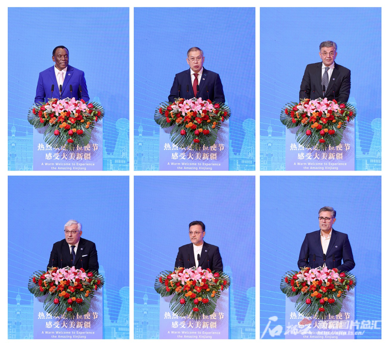 4月10日,南非驻华大使谢胜文、哈萨克斯坦驻华大使努雷舍夫、叙利亚驻华大使哈桑内、土耳其驻华大使穆萨、伊朗驻华大使巴赫蒂亚尔、巴基斯坦驻华大使哈什米先后在交流会上发言(由左至右、由上至下)。石榴云/新疆日报记者 崔志坚摄