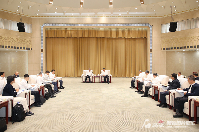 8月20日至22日,安徽省委副书记、省长王清宪率安徽省代表团来新疆考察对接对口支援工作。这是8月20日,自治区党委书记、兵团党委第一书记、第一政委马兴瑞,自治区党委副书记、自治区主席艾尔肯·吐尼亚孜在乌鲁木齐会见代表团一行。石榴云/新疆日报记者 崔志坚摄