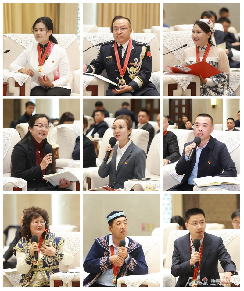 会见中,帕提古丽·亚森、庞欣、则温尼沙·阿布都卡地尔、姚红玉、迪达尔·库钠依、王玮、法蒂玛、胡拥军、黎立代表模范集体和个人依次发言(由左至右、由上至下)。石榴云/新疆日报记者 崔志坚摄