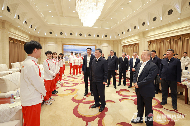 11月25日,自治区党委书记、兵团党委第一书记、第一政委马兴瑞,自治区党委副书记、自治区主席艾尔肯·吐尼亚孜在乌鲁木齐会见国家体育总局党组书记、局长高志丹和参加“决胜巴黎·绽放奥运——奥运冠军面对面”巡回宣讲活动的奥运健儿代表。石榴云/新疆日报记者 崔志坚摄
