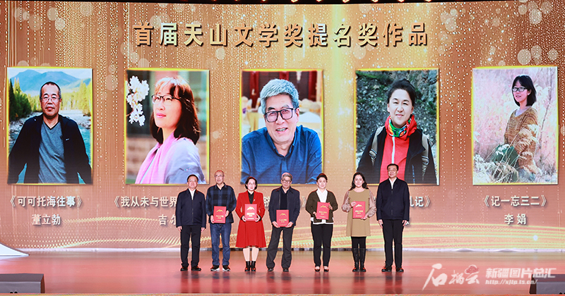12月20日晚,张柱、阎晶明为董立勃的长篇小说《可可托海往事》、吉尔的诗歌集《我从未与世界如此和解》、李健的中短篇小说集《脐血之地》、李娟的散文集《记一忘三二》、周智慧的散文集《解忧牧场札记》等五部作品颁授天山文学奖提名奖。石榴云/新疆日报记者 崔志坚摄