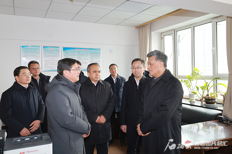 2月5日,自治区党委书记马兴瑞、自治区主席艾尔肯·吐尼亚孜在自治区统计局国民经济核算处,详细询问各项工作进展。石榴云/新疆日报记者 崔志坚摄