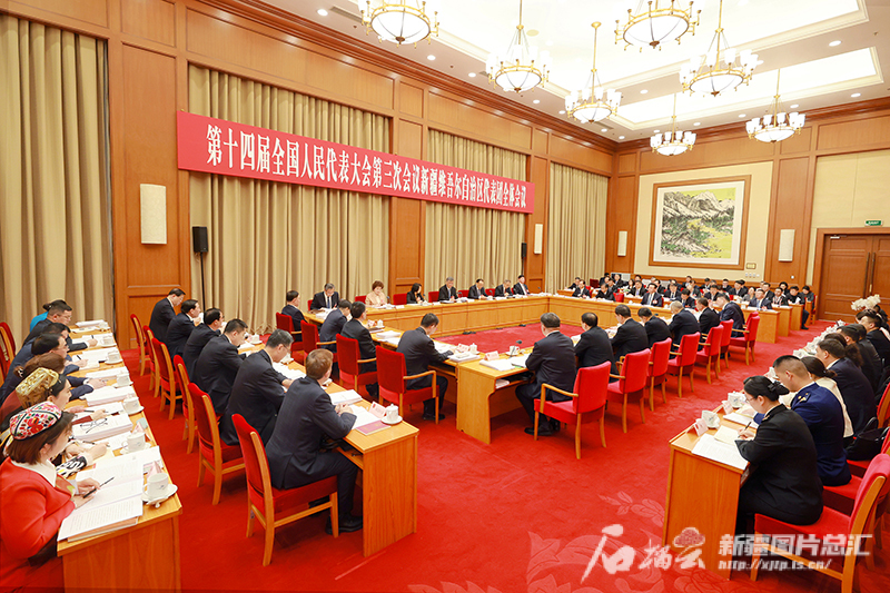 3月5日,参加十四届全国人大三次会议的新疆代表团举行全体会议,审议政府工作报告。石榴云/新疆日报记者 崔志坚摄