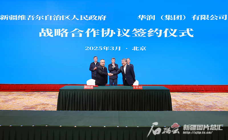 3月12日,在中央企业产业兴疆重点项目2025年投资推进会上,自治区党委副书记、自治区主席艾尔肯·吐尼亚孜与华润集团总经理王崔军签署自治区人民政府与华润集团战略合作协议。石榴云/新疆日报记者 崔志坚摄