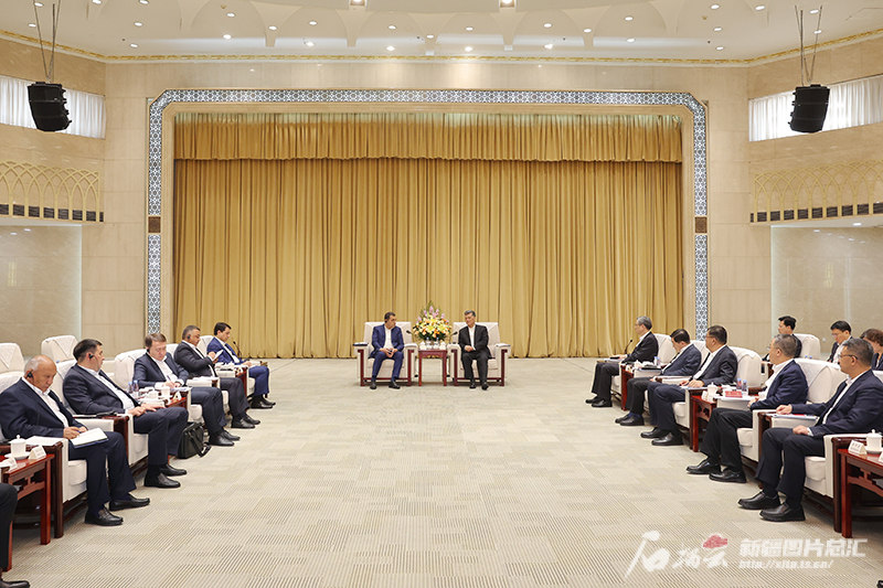4月14日,自治区党委书记马兴瑞在乌鲁木齐会见乌兹别克斯坦费尔干纳州州长博扎罗夫一行。石榴云/新疆日报记者 崔志坚 摄