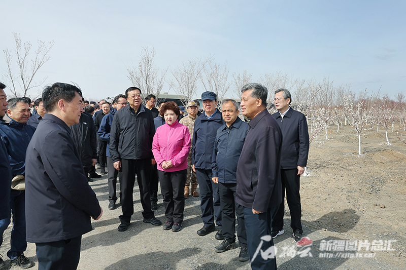 4月19日,自治区党委书记马兴瑞,自治区党委副书记、自治区主席艾尔肯·吐尼亚孜等在参加义务植树活动时,向相关负责同志询问这一片区植树造林和郊野公园建设情况。石榴云/新疆日报记者 崔志坚摄