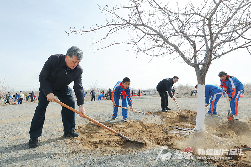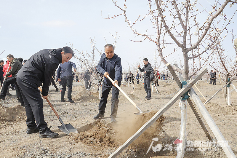 4月19日,自治区党委副书记、自治区主席艾尔肯·吐尼亚孜在乌鲁木齐县乌板乌水公路两侧生态防护林建设工程现场,参加义务植树活动。石榴云/新疆日报记者 谢龙摄