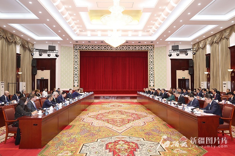 5月12日,自治区党委书记马兴瑞,教育部党组书记、部长怀进鹏在乌鲁木齐会见来新疆出席首届中国—中亚教育部长会议、第九届上海合作组织成员国教育部长会议和2025中国—中亚产学研用合作会议的中外重要嘉宾。石榴云/新疆日报记者 崔志坚 摄