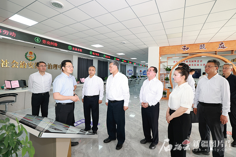 5月25日,自治区党委书记、兵团党委第一书记、第一政委马兴瑞,自治区党委副书记、自治区主席艾尔肯·吐尼亚孜在新和县社会治安综治中心,了解各项工作开展情况。石榴云/新疆日报记者 崔志坚 摄