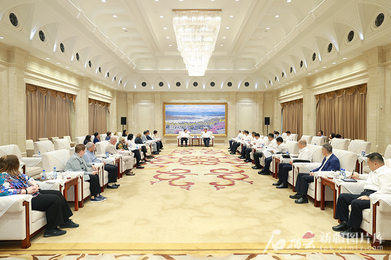 6月26日,自治区党委书记马兴瑞在乌鲁木齐会见“世界汉学家看中国·新疆行”参访团一行。石榴云/新疆日报记者 崔志坚 摄