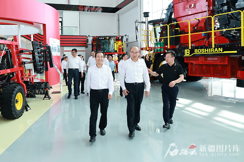 7月10日,黑龙江省委书记、省人大常委会主任许勤,自治区党委书记、兵团党委第一书记陈小江在乌鲁木齐钵施然智能农机有限公司,实地了解企业运行、产品研发等情况。石榴云/新疆日报记者 崔志坚 摄