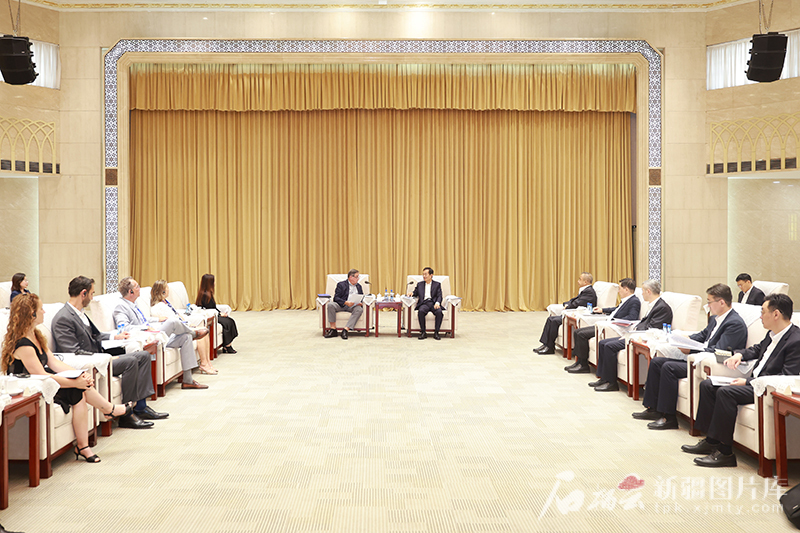 7月21日,自治区党委书记陈小江、自治区主席艾尔肯·吐尼亚孜在乌鲁木齐会见参加中美“飞虎队”友谊合作论坛的美中航空遗产基金会主席格林等外宾代表。石榴云/新疆日报记者 崔志坚 摄