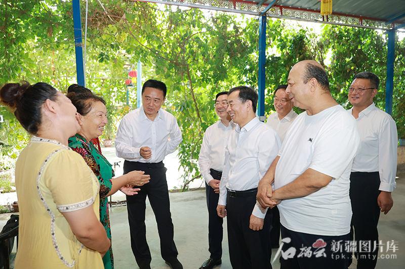 7月29日,自治区党委书记、兵团党委第一书记、第一政委陈小江来到库尔勒市阿瓦提乡吾夏克铁热克村,了解乡村产业情况,看望阿依古丽·吾买尔一家。石榴云/新疆日报记者 崔志坚 摄