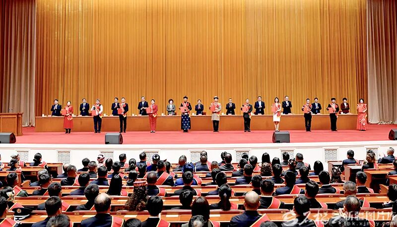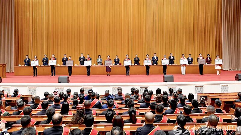 10月16日,自治区党委书记、兵团党委第一书记、第一政委陈小江,自治区党委副书记、自治区主席艾尔肯·吐尼亚孜等领导为荣获模范个人代表颁发荣誉证书和奖章。石榴云/新疆日报记者 韩亮摄
