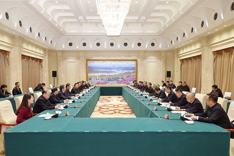11月20日,自治区党委书记陈小江、自治区主席艾尔肯·吐尼亚孜在乌鲁木齐会见水利部党组书记、部长李国英一行。天山网-新疆日报记者 崔志坚 摄