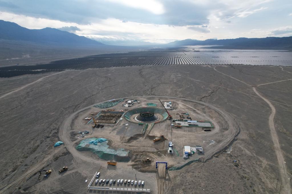 在精河新华新能源有限公司精河县10万千瓦储热型光热项目建设现场,施工人员在紧张有序地作业。目前该项目吸热塔基础浇筑至0米,SGS承台基础浇筑完成,主厂房基础开挖完成,厂前区办公楼、值修楼、食堂承台基础浇筑完成,定日镜组装车间钢结构安装完成。