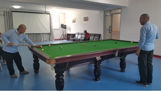 院内老人上午跟着工作人员做手指操,回春健身操等,下午则精心准备适合老年人参与的趣味游戏项目,如下象棋,做手工,投篮球、套圈圈、打台球等等,保证每日不重样。参加活动的老人最大的85岁,最小的也有60岁,虽然岁数不小,各个精神抖擞,每个项目都突出一个“乐”字,欢笑声不绝于耳,活动现场一片热闹景象。