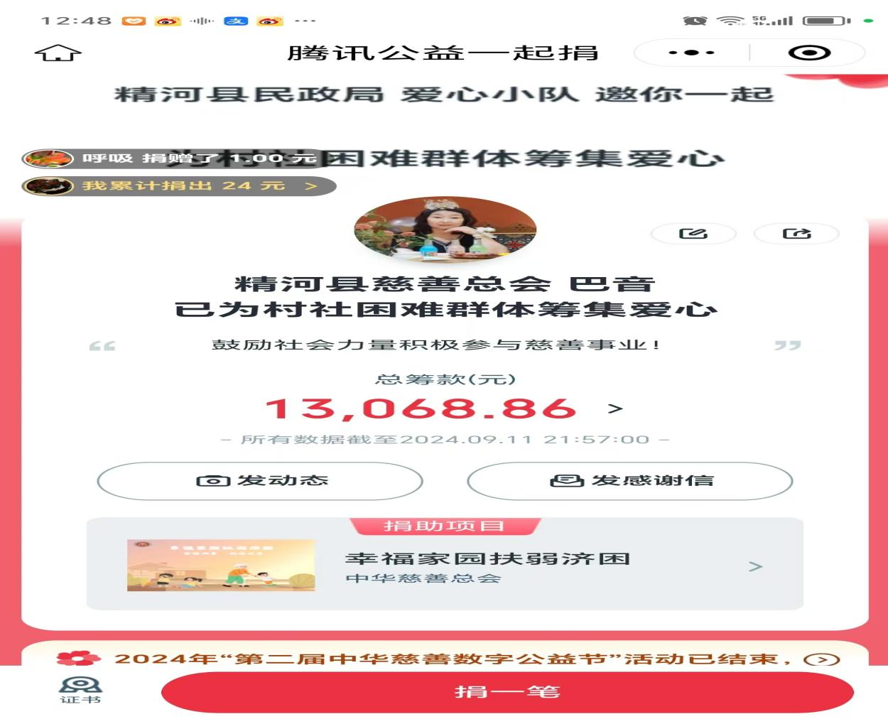9月5日是我国“第九个中华慈善日”,自治区慈善总会以聚焦“一老一小” 守护朝夕美好为主题,为弘扬中华民族传统慈善美德,践行好“中华慈善日”精河县慈善总会开展线上筹集活动。精河县民政局党组副书记、局长武常胜同志带头,发动广大党员干部、群众、社会各界、爱心人士、爱心单位以力所能及的方式参与到此次慈善线上募捐活动并组织开展腾讯公益“一起捐”活动。通过实地宣传、微信、网络、电话等平台广泛宣传,动员党员、干部、群众参与募捐。募捐活动本着“个人自愿、鼓励奉献”的原则,截至目前,大家用“爱心”汇聚力量,用“慈善”传递温暖,以个人的微薄力量为特殊困难老年人和儿童送去温暖。