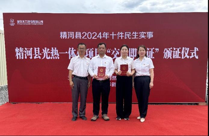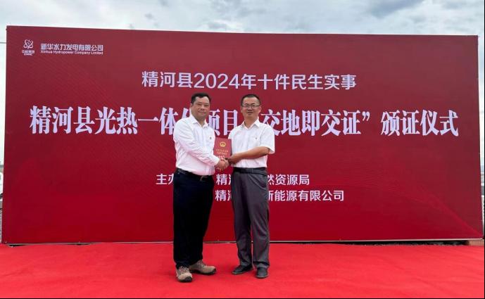 6月14日,精河县2024年首例“交地即交证”颁证仪式在精河县五台光热一体化项目现场举行。现场,精河新华新能源有限公司党委委员、副总经理杨彬从精河县自然资源局党组书记刘永疆手中接过了“不动产权证书”,标志着精河县2024年首例“交地即交证”项目顺利落地。