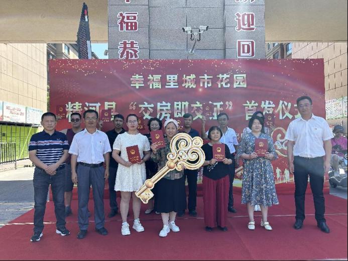 7月12日,精河县幸福里房地产开发有限公司幸福里城市花园项目举行“交房即交证”颁证仪式,前来办理交房手续的业主们一手拿着钥匙,一手拿着不动产权证书,率先体验了“住权产权无距离,交房交证无时差”的暖心服务。