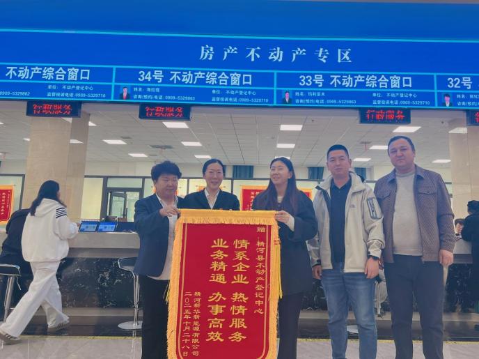 2025年10月28日,精河县新华新能源有限公司工作人员前来办理登记,精河县不动产登记窗口工作人员与企业沟通需求、解答政策疑惑,指导材料的准备与审核,并同步完成权籍调查、信息录入等工作,大幅缩短了业务办理时间。“服务效率高,为我们节省大量时间和精力,让我们能更专注于企业经营,真的非常感谢!”该公司负责人专程前来窗口说道,并送来锦旗,以表感谢。