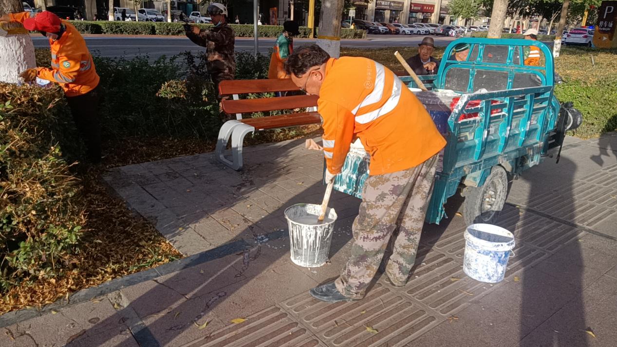 涂白现场,园林工人着重对树皮缝隙、洞孔等部位进行反复涂白处理,严格按照比例配置涂白石灰,为人行道的树干底部涂抹白色“保护霜”。为保质保量完成树木涂白工作,采取“任务分片、人员分段、优先主干道”的方法,明确职责、分区实施,保证树木涂白过程中一株不漏,并按照标准操作,做到止口平整、高度一致、涂白均匀。据了解,树木“涂白”是绿化养护的一项重要措施,“涂白”后树木能反射阳光、缩小昼夜温差,从而减少冻害发生。涂白剂中含有石灰、石硫合剂等,能起到杀菌灭虫作用,可有效减少树干树皮中害虫隐匿和滋生。涂白工作为行道树木穿上统一的白色“新衣”,达到整体美观的效果。