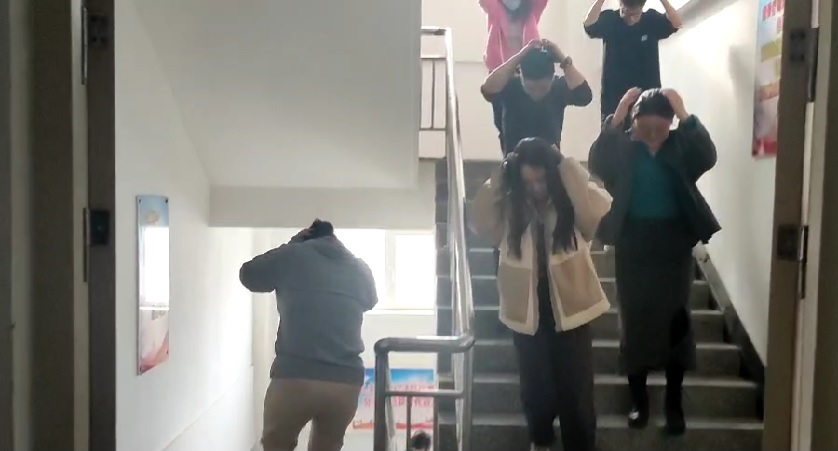 随着演练总指挥的一声令下,地震演练正式拉开序幕。各楼层信号员吹响应急哨,发出“地震警报”信号,各楼层负责人立即告知其他干部职工迅速抱头、降低身体重心,尽可能用公文包或厚重书本保护头部,并按既定路线迅速下楼,到达指定位置。