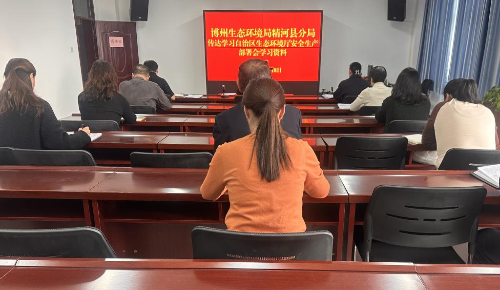 为确保生态环境安全及各项工作有序开展,11月18日,博州生态环境局精河县分局组织全体干部学习“自治区生态环境厅安全生产部署”会议精神,会议由生态环境局精河县分局党组书记、副局长刘亚军主持。