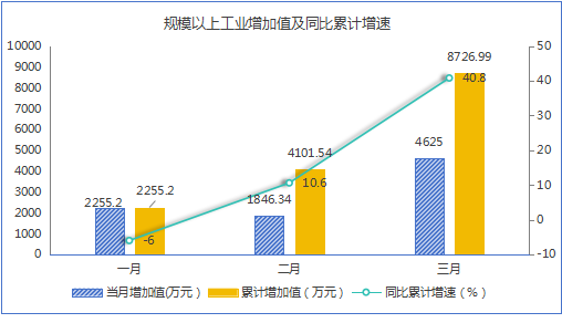 一季度,精河县规模以上工业企业实现增加值0.87亿元,同比增长40.8%,其中:3月当月实现增加值0.46亿元,同比增长71.5%。