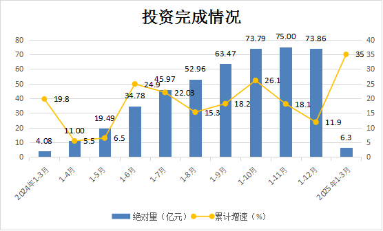 ㈡设备投资强势上扬。3月度大量新开工项目涌现,为投资增长提供了基础,设备工器具购置完成4.5亿元,占总投资71%,同比增长1.3倍,华能精河产业园区低碳转型光伏项目完成设备投资占比过半。