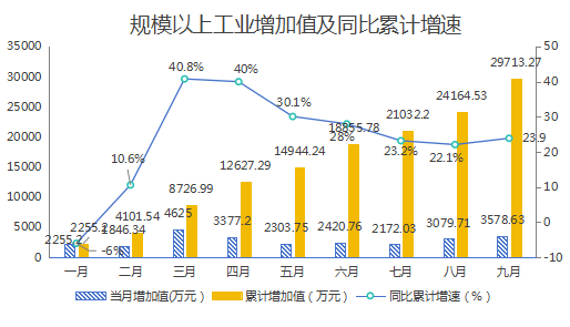㈠轻重工业均实现正增长。1-9月份,重工业完成产值7.24亿元,实现增加值2.34亿元,占规模以上工业增加值的比重达78.8%,同比增长19.6%,拉动工业增加值增长15.8个百分点,是工业经济增长的绝对主力。轻工业完成产值3.34亿元。实现增加值0.63亿元,占比21.2%,虽体量相对较小,但同比增速达35.6%,显著高于重工业增速,拉动工业增加值增长6.9个百分点,成为增长中的“亮点板块”。