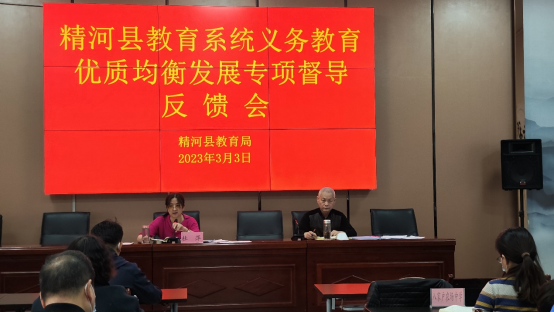 3月3日,精河县人民政府教育督导室组织召开专项督导反馈会,县党委教育工委副书记、教育局党组书记、副局长杜萍,义务教育优质均衡发展指标组成员,教育局相关科室负责人、督导室全体督学,各中小学书记、校长50余人参加会议。