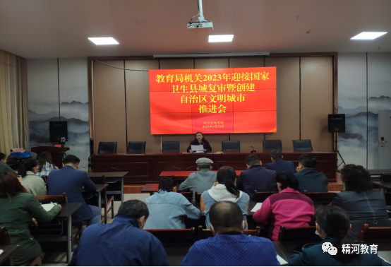 为提升县城人居环境质量,全面做好国家卫生县城复审工作,4月24日,精河县教育局召开2023年迎接国家卫生县城复审暨创建自治区文明城市推进会。会议由县教育局党组成员、教育工会主席加孜拉·巴哈提主持,县教育局在家班子成员、各科室主任及干部50余人参加会议。