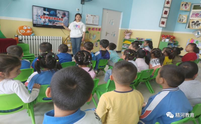 精河县第三幼儿园通过开展健康教育活动向幼儿介绍碘缺乏的危害性,以及如何防治碘缺乏病的措施等。并利用微信平台向家长介绍了防治缺碘措施及碘盐的识别和使用方法等基本常识,使宣传活动更加广泛深入。