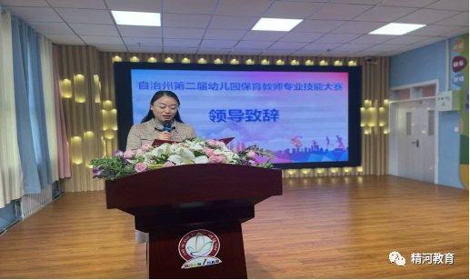自治州学前教研基地校主任马俊玲在比赛致辞中说道:此次比赛为全州各幼儿园保育教师提供展示自我、挑战自我、相互学习交流的平台。通过竞赛的形式,有助于增加教师之间的专业交流,有助于促进幼儿保育教师的职业素养,更好地践行《纲要》和《指南》精神,把满腔热血倾注在孩子们身上,担负起促进幼儿身心和谐发展的重要任务。