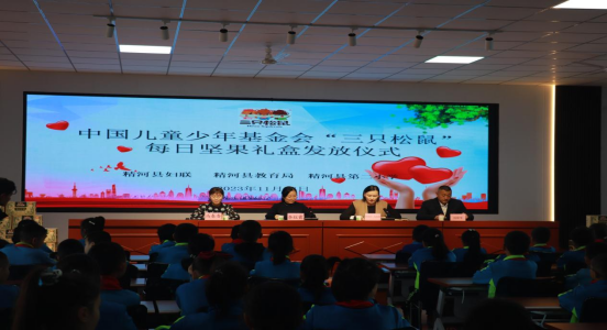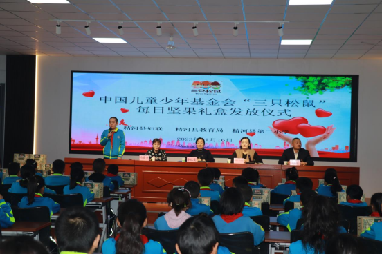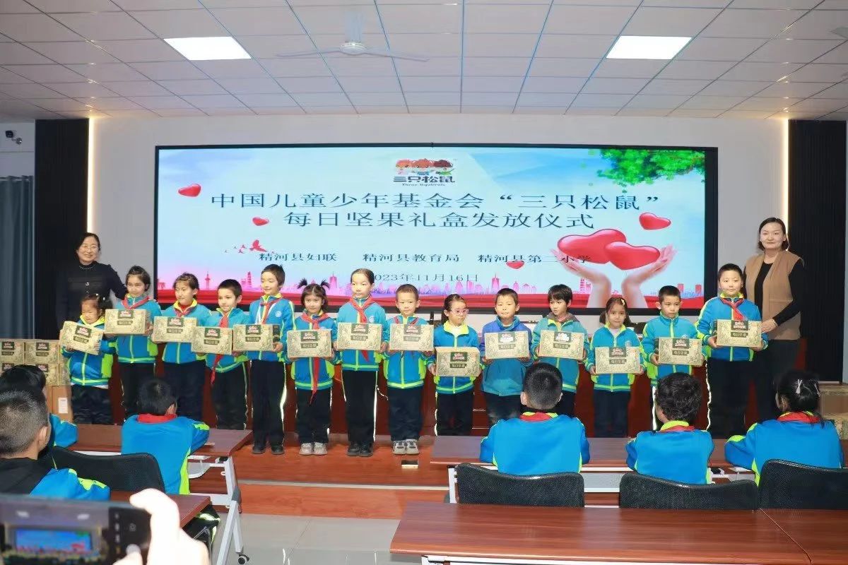 11月16日下午,精河县妇联在县第二小学举行中国儿童少年基金会“三只松鼠”每日坚果礼盒发放活动。