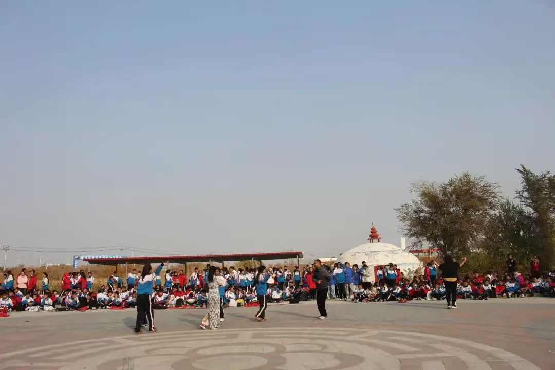 午后,敖包东归广场变成红色文化课堂。《我的祖国》合唱气势磅礴,《长征之歌》朗诵引发共鸣,冬不拉弹奏传递着民族风情。当欢快的麦西来甫乐曲响起,师生共舞,疲惫在歌舞中消散。