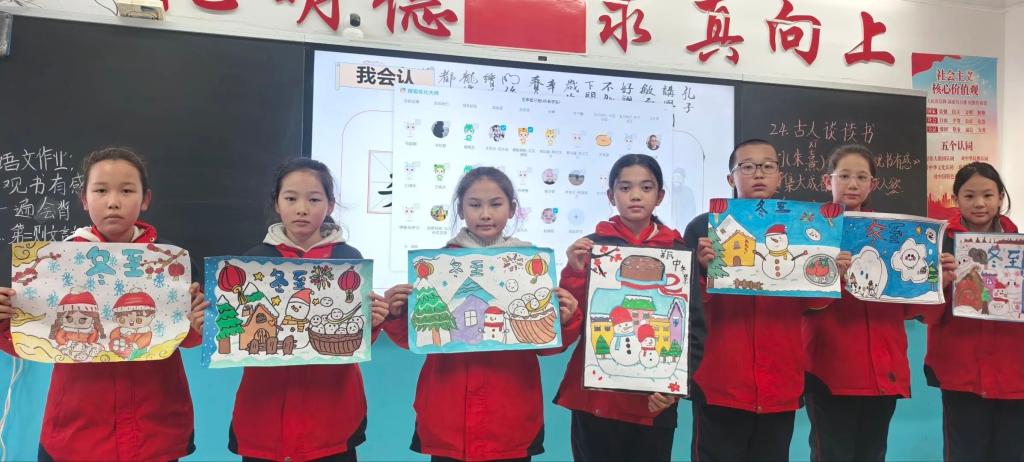 “冬至不端饺子碗,冻掉耳朵没人管”——在大河沿子镇第一小学,一二年级的童谣歌声朗朗上口;三四年级的“文化小达人”们在探究节气渊源、吟诵古典诗词;高年级学生以画笔解读传统,完成从浅层认知到内涵理解的文化进阶。
