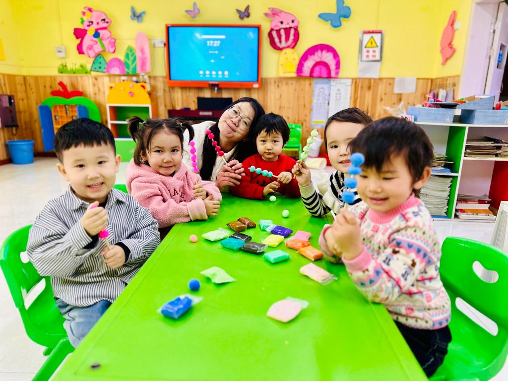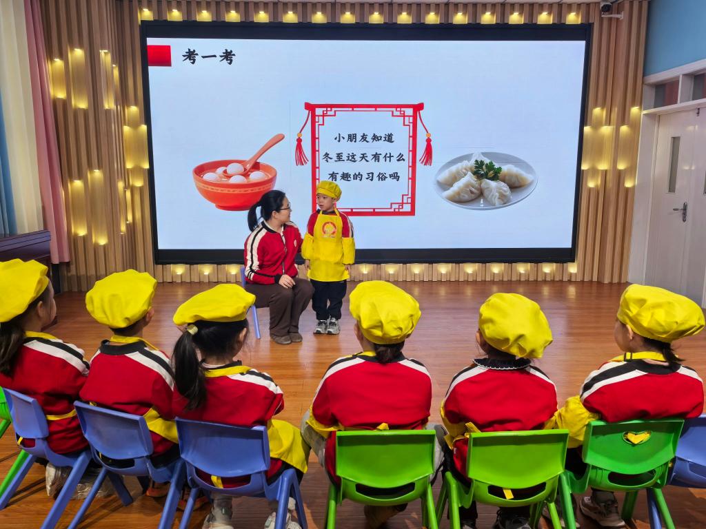 同样的深度体验在各幼儿园生动上演。老师们化身“民俗讲解员”,借助故事、动画与图片,在各幼儿园中悄然解锁冬至文化密码。大河沿子镇第二幼儿园与湖北襄阳市直机关第二幼儿园云端联动,以手势舞《冬至歌》、诗歌《数九歌》隔空呼应,让节气知识在互动中内化为文化自信。