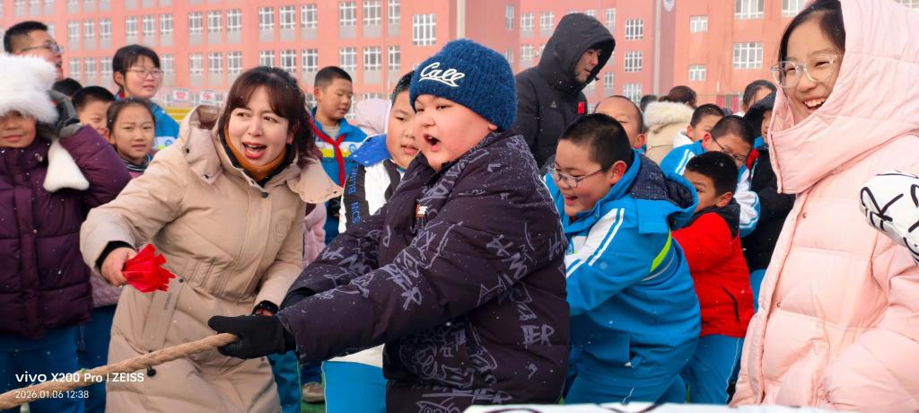 同样热闹的还有八家户农场小学,这里举办的亲子冰雪活动格外温馨。积雪操场化身欢乐赛场,“亲子赛”中家长拉着坐在雪圈上的孩子奋力冲刺;“车轮滚滚”项目里,10人小队喊着口号翻动轮胎接力,汗水与笑声交织;雪地运输队接力赛里,各年级学生分组上阵,单手运送篮球向指定地点进发,孩子们稳步前行、彼此鼓劲,在接力中展现出良好的团队风貌。