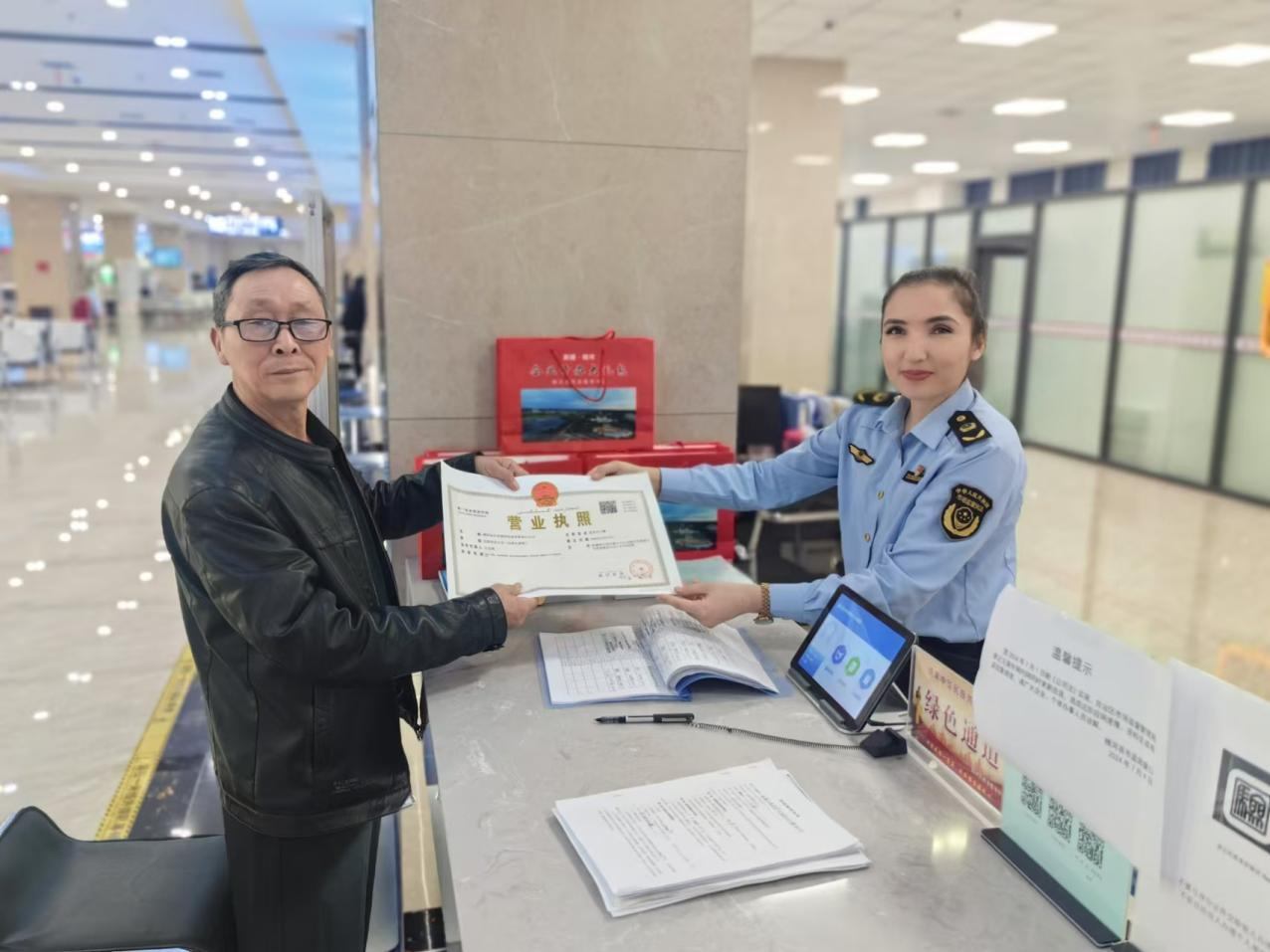 11月5日,王先生在精河县行政服务中心市场监督管理局窗口办理了个体工商户转型升级业务,拿到了精河县首个“个转企”营业执照。