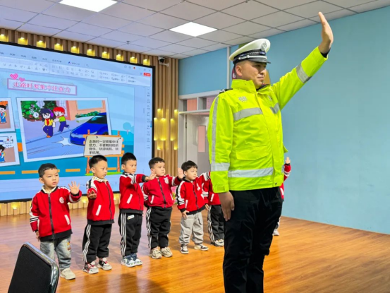 最精彩的要数民警教小朋友们认识交警手势环节,民警带着特制的交警手势卡片,边展示边讲解,孩子们跟着学,在轻松欢快的氛围里,孩子们逐渐对常见的交警手势有了印象,小手在空中挥舞得有模有样。