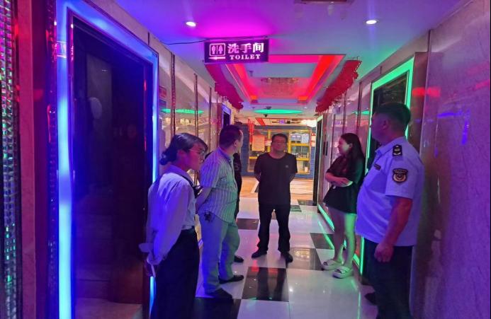 检查过程中,各部门执法人员重点对场所是否接纳未成年人、是否张贴未成年人禁止入内或限入标志;歌曲点播系统视频画面、语言文字、歌词曲目等是否含有《娱乐场所管理条例》第三十条规定的禁止内容;营业日志是否规范填写;是否有相关证照;产品质量是否合格;安全出口指示标示标牌是否张贴在明显位置;消防通道是否畅通、消防器材和消防设施设备是否正常运行;是否制定应急预案、是否开展消防应急演练等12项内容进行检查。