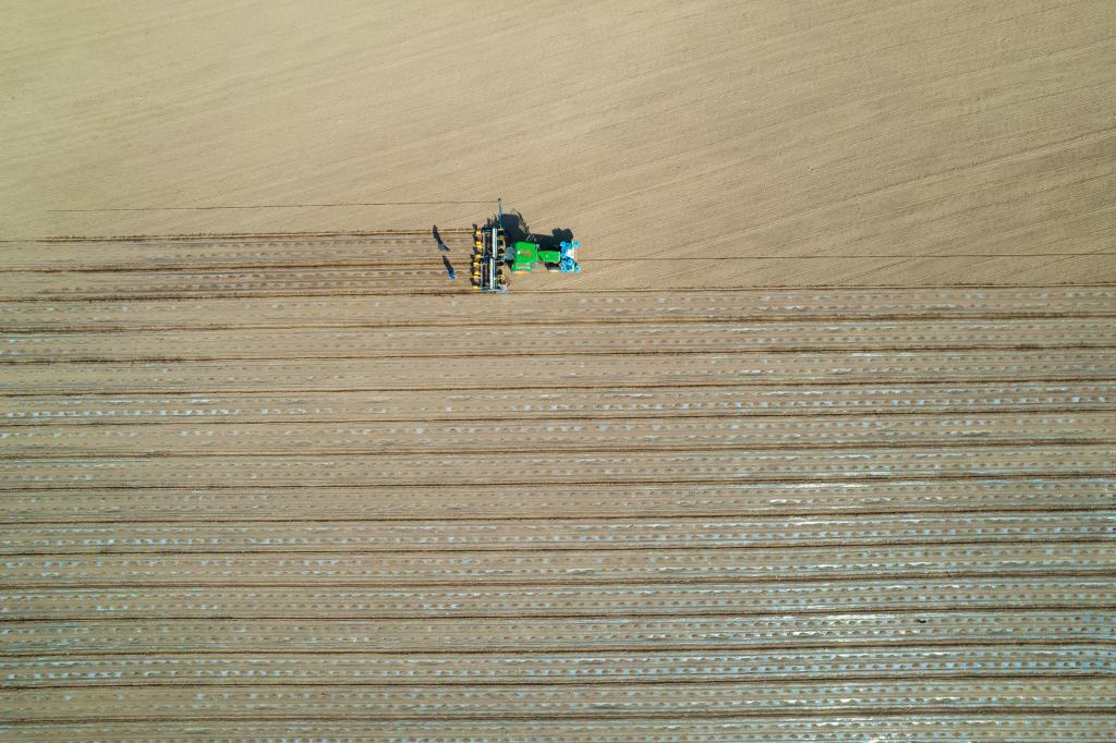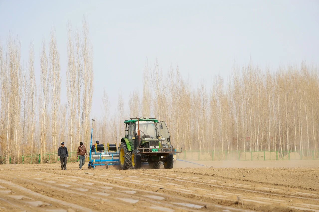 3月28日,精河县大河沿子镇呼和哈夏南村棉田地内,棉农驾驶一台装有北斗卫星定位导航系统的大型播种机缓缓前行,完成铺设地膜、滴灌带、精量播种等作业流程,几名工人紧跟播种机,察看开沟、下种、铺膜、覆土情况。