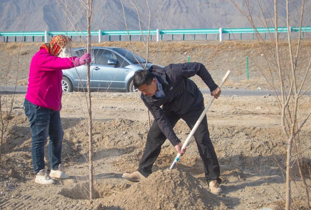 4月7日上午,在向阳社区国道旁植树点,大河沿子镇党委、政府领导班子、镇机关干部、向阳社区“六位一体”干部以及村民等100余人参加义务植树活动。