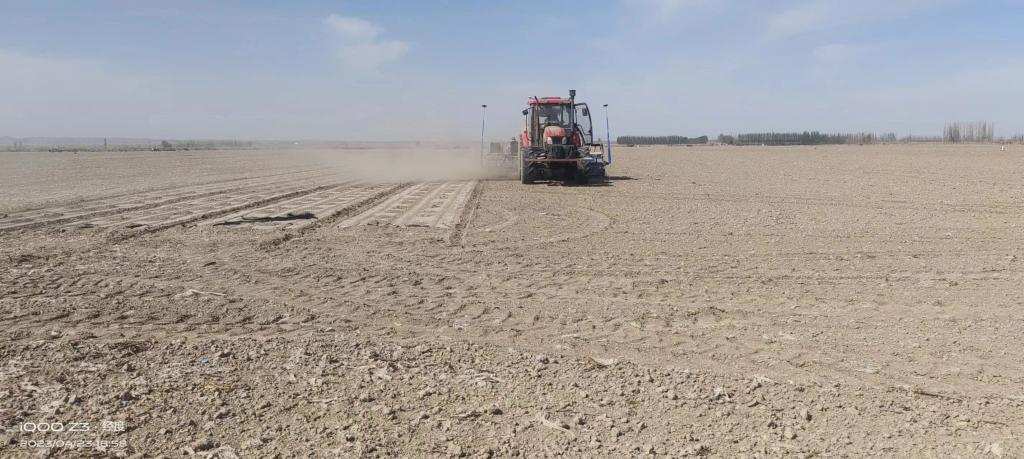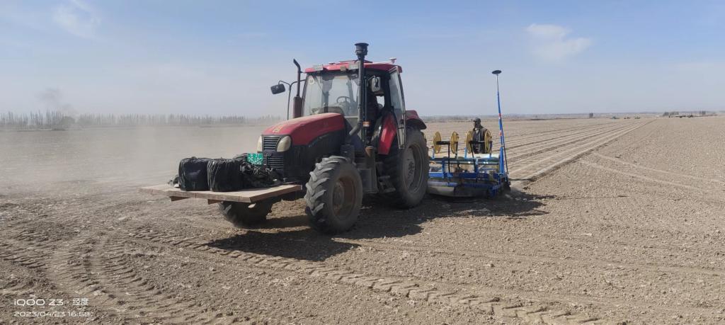 4月23日,大河沿子镇呼苏木齐村的一千亩棉花示范田种植拉开序幕。棉田地里棉农驾驶一台装有北斗卫星定位导航系统的大型播种机缓缓前行,完成铺设地膜、滴灌带、精量播种等作业流程,2名工人紧跟播种机,查看开沟、下种、铺膜、覆土情况。