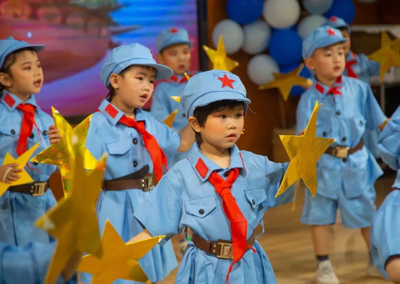 活动当天,幼儿园变得五彩缤纷,色彩斑斓,舞台上花团锦簇,英姿飒爽的“小红军”们踏着铿锵有力的步伐闪亮登场,嘹亮的号角,红色的赞歌,奏响新时代的旋律,小朋友们身着红军服,头戴红军帽,手上的五角星像一簇簇跳动的火焰,共同诉说着对祖国的热爱。