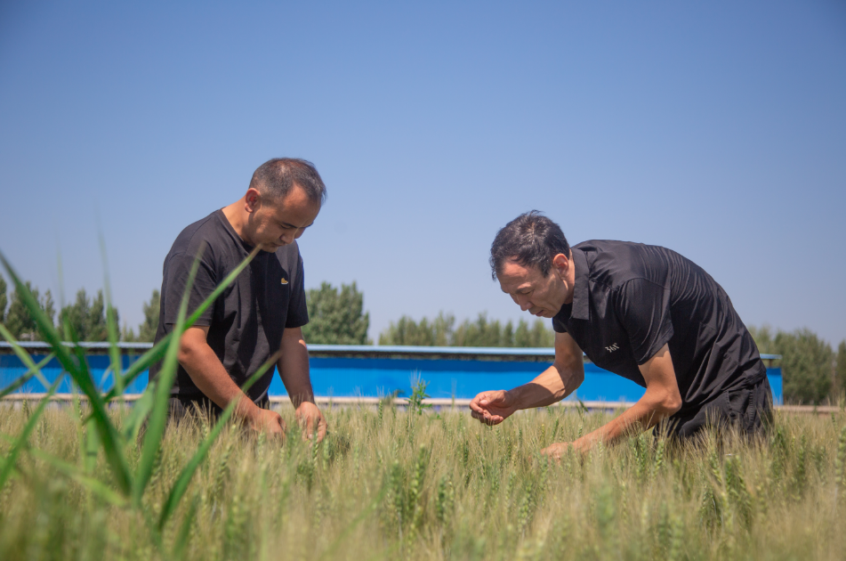 6月12日,笔者在夏尔托热村的麦田里看到,大河沿子镇农业(畜牧业)发展服务中心技术人员正在观察小麦的长势情况。