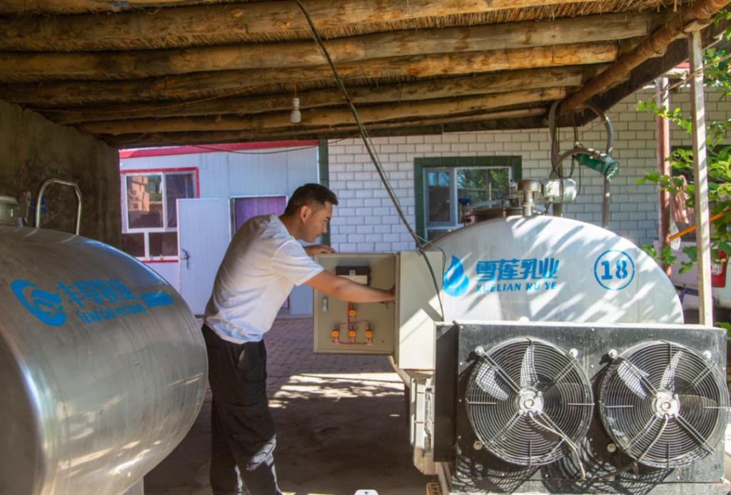 走进依斯哈提·吐尔孙白克庭院里,坐落着三个冷藏罐保鲜设备,每一个冷藏罐可以解决一吨骆驼鲜奶保鲜问题。