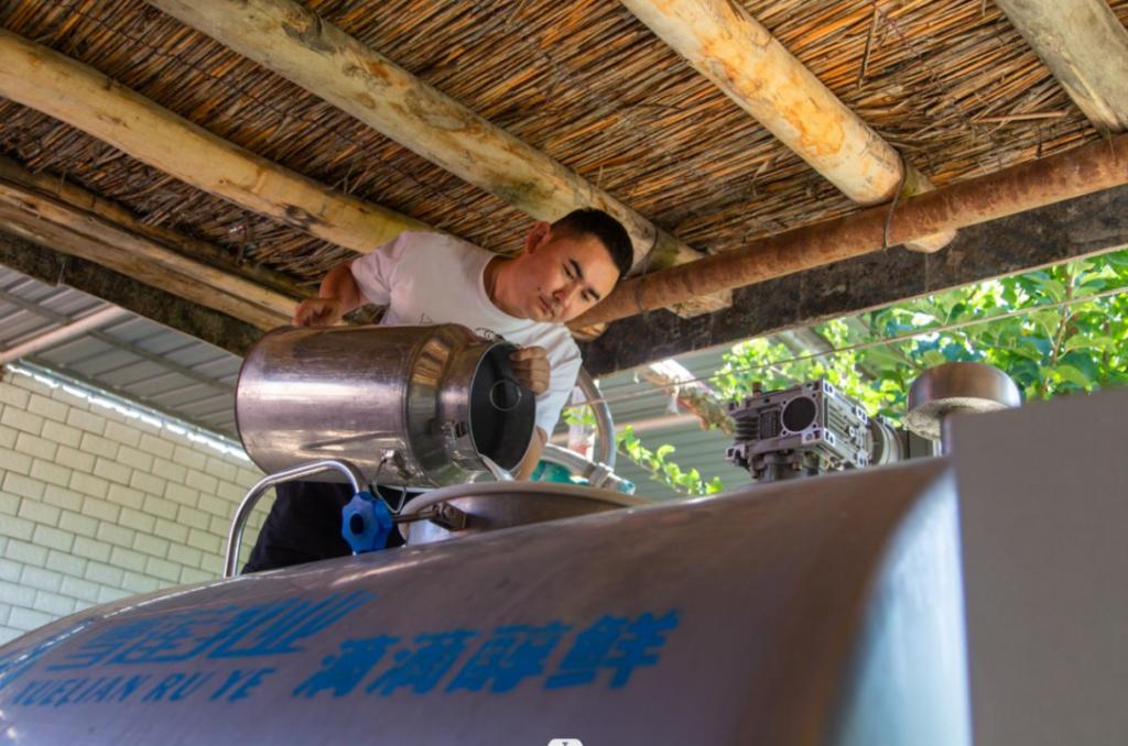 通过了解,这些冷藏罐、保鲜设备是依斯哈提·吐尔孙白克和父亲在2018年专门跑到伊宁县乳业生产企业去学习保鲜技术,投入30万元在自家庭院内建设了标准化奶站,引进冷藏设备,皮卡车也量身定做了一个冷藏罐,用来解决驼奶远距离运输。驼鲜奶收购站后,这些养殖骆驼的牧民再也不用为骆驼鲜奶的销售问题发愁,依斯哈提·吐尔孙白克和父亲一起收集周边养殖户的驼奶,统一销售,带动牧民一起增收致富。